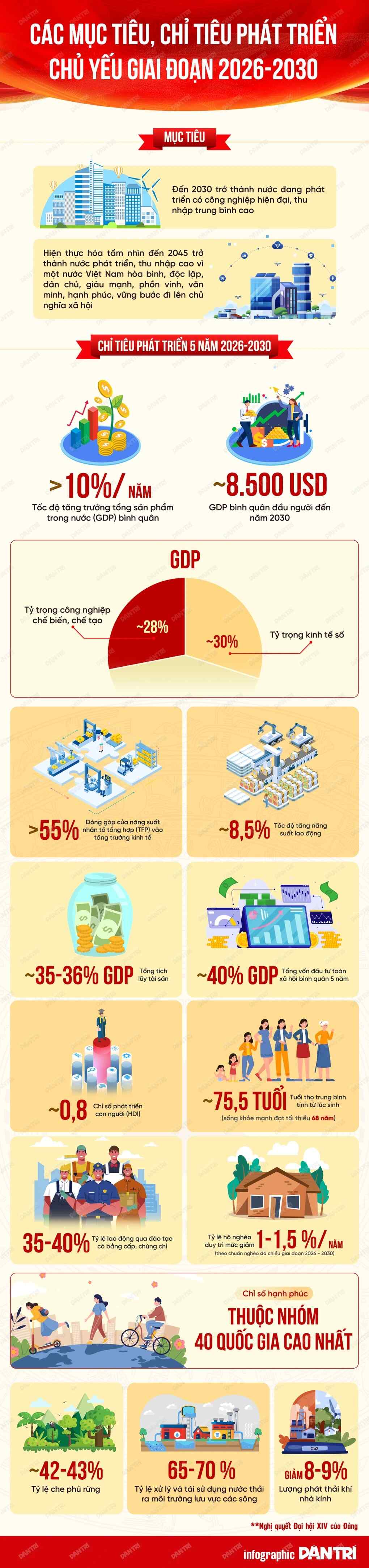 Các mục tiêu, chỉ tiêu phát triển trong Nghị quyết Đại hội XIV của Đảng